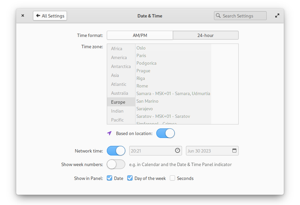 In the **Date & Time** section, you can set up the current date and time, time zone you are in, and the date & time format that can be seen in the Date & Time Panel indicator, Calendar, and other apps.